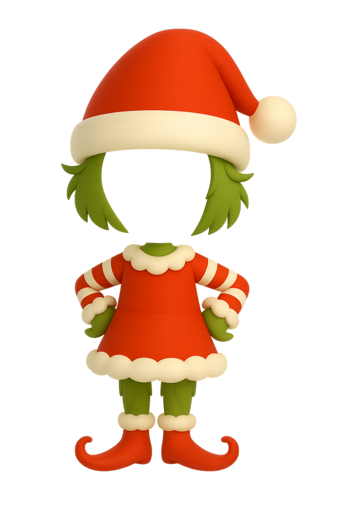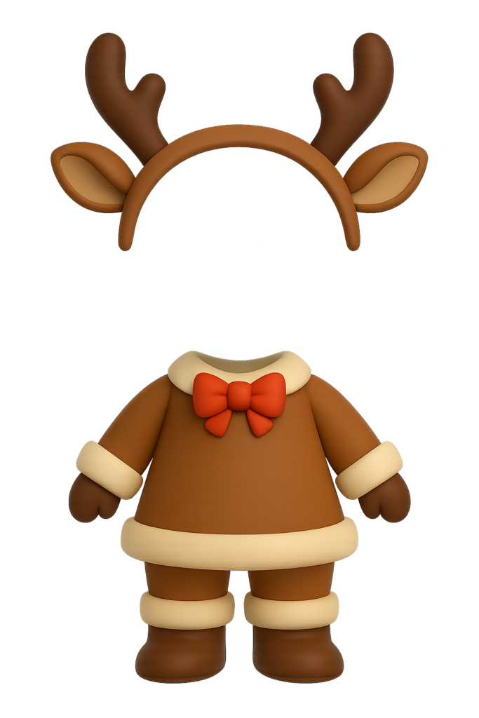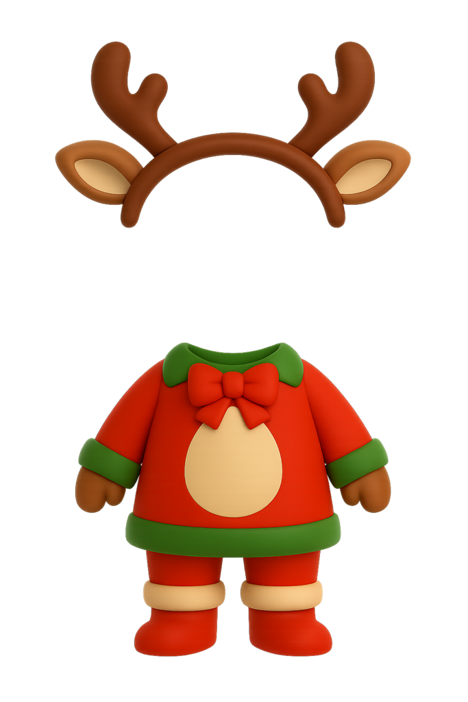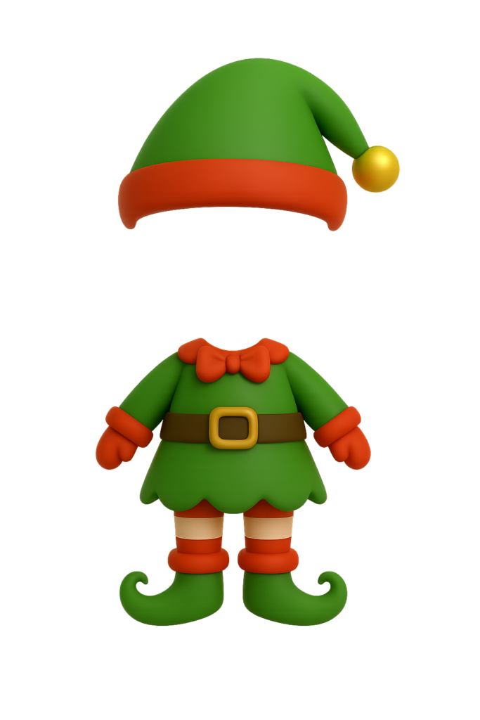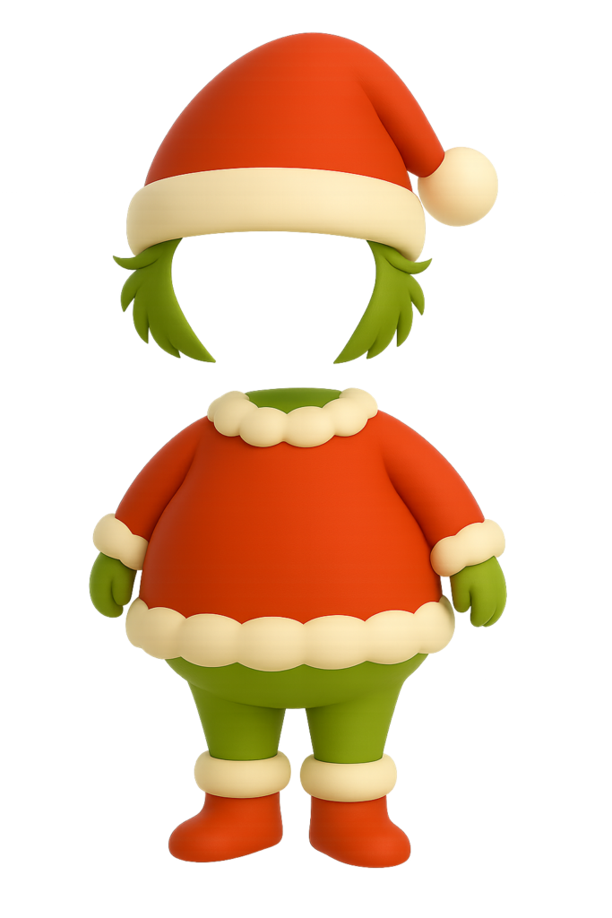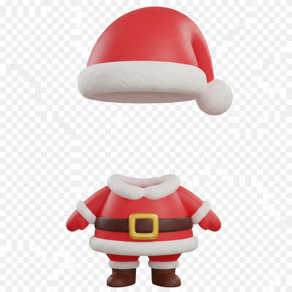 “3D rendered Santa Claus outfit in chibi cartoon style. Large red Santa hat with white trim floating above the body, leaving a clean empty space where the head should be. No face, no circle, no placeholder—just an open gap. Below, a tiny chibi Santa body with red suit, white fluffy trim, gold belt buckle, red gloves, and brown boots. Soft plastic-toy texture, smooth shading, rounded shapes, warm Christmas colors. High-quality 3D look, studio lighting, glossy details. Transparent background (alpha), no shadows, no glow, no environment.”